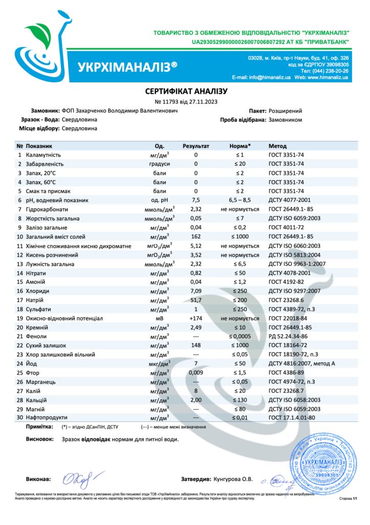 Якість нашої артезіанської води підтверджено результатами аналізів і сертифікатами які відповідають міжнародним стандартам. Наша вода регулярно проходить тестування в лабораторії та перевірки на лінії розливу по контролю якості!